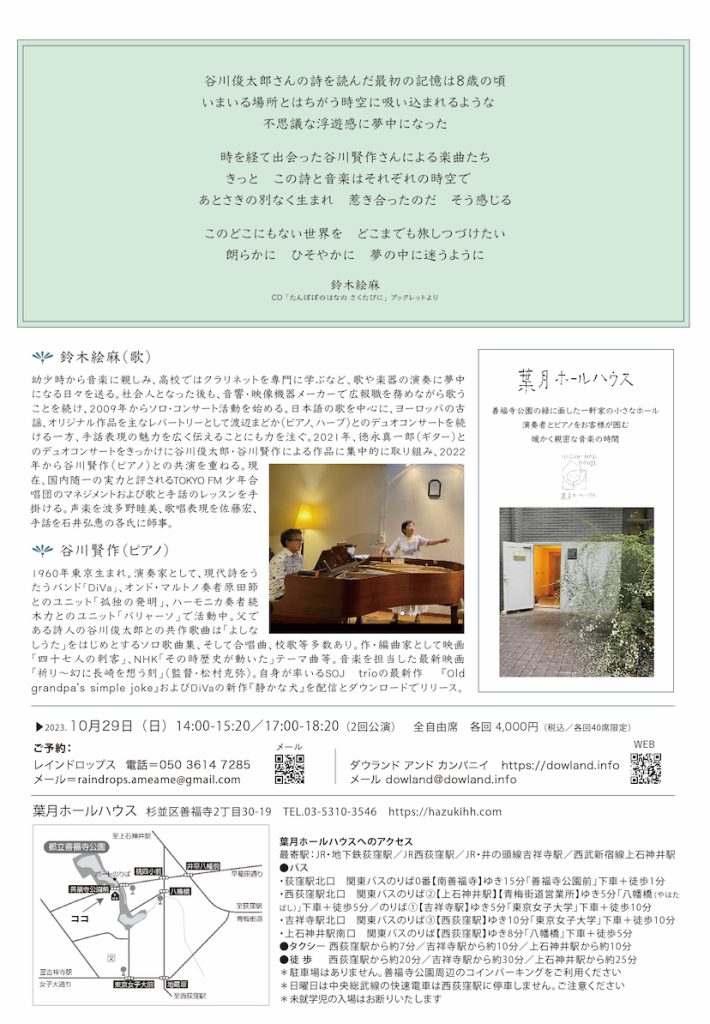 プロフィール ■鈴木絵麻(歌) Emma Suzuki 幼少時から音楽に親しみ、高校ではクラリネットを専門に学ぶなど、歌や楽器の演奏に夢中になる日々を送る。社会人となった後も、音響・映像機器メーカーで広報職を務めながら歌うことを続け、2009年からソロ・コンサート活動を始める。日本語の歌を中心に、ヨーロッパの古謡、オリジナル作品を主なレパートリーとして渡辺まどか(ピアノ、ハープ)とのデュオコンサートを続ける一方、手話表現の魅力を広く伝えることにも力を注ぐ。2021年、徳永真一郎(ギター)とのデュオコンサートをきっかけに谷川俊太郎・谷川賢作による作品に集中的に取り組み、2022年から谷川賢作(ピアノ)との共演を重ねる。現在、国内随一の実力と評されるTOKYO FM 少年合唱団のマネジメントおよび歌と手話のレッスンを手掛ける。声楽を波多野睦美、歌唱表現を佐藤宏、手話を石井弘恵の各氏に師事。