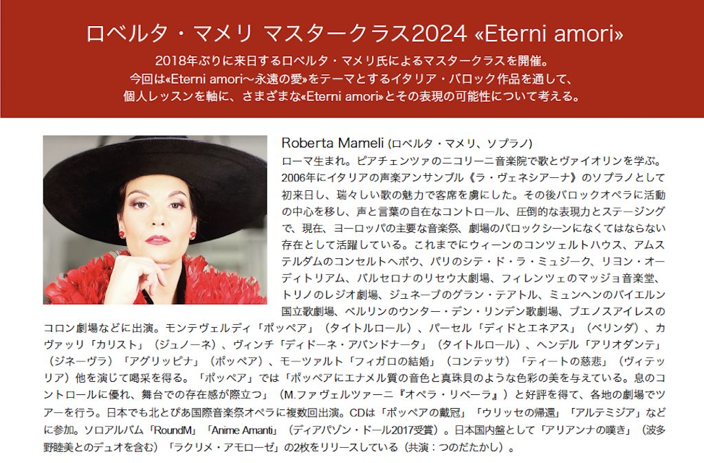 ロベルタ・マメリ 波多野睦美公演 追加席販売のお知らせ 12月10日 ルーテル市ヶ谷ホールでの公演は、予定枚数を終了しました。11月上旬、追加補助椅子席(パイプ椅子)を若干数販売します。 Read More 2024年10月27日